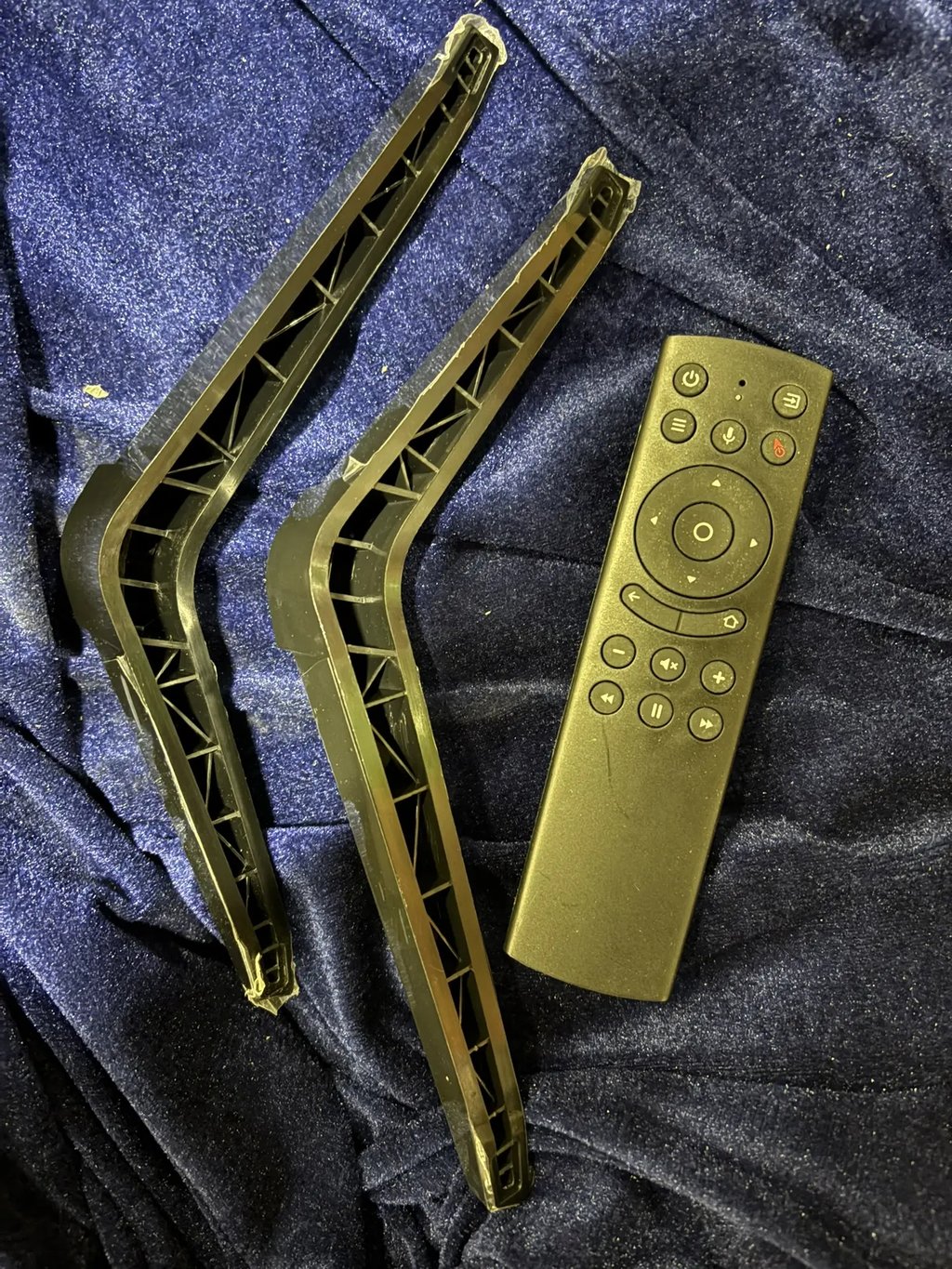 Упаковка вскрывалась. Оборудование использовалось. Потертости и царапины на корпусе. В комплекте пульт и ножки. Нет винтов для крепления ножек.