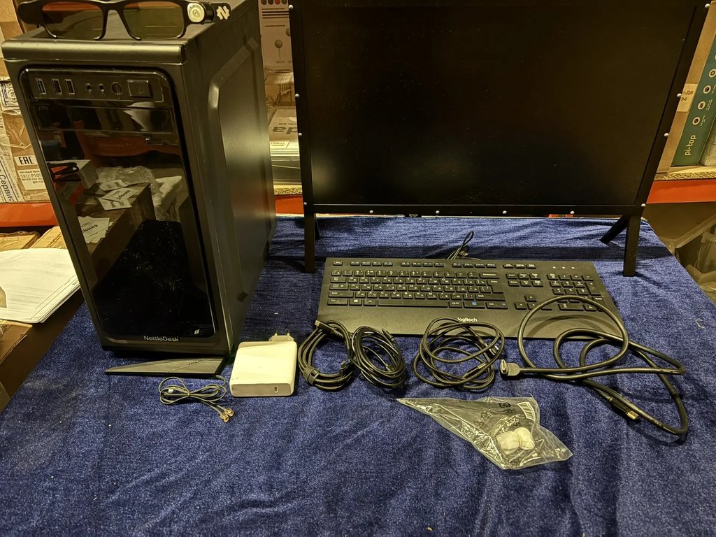 Упаковка вскрывалась. Оборудование использовалось. Есть вмятинки, царапины, сколы. В комплекте системный блок, монитор, клавиатура, кабели type c и hdmi , блок питания к монитору, очки, wi-fi антенна. Нет мыши и кабеля питания для системного блока.