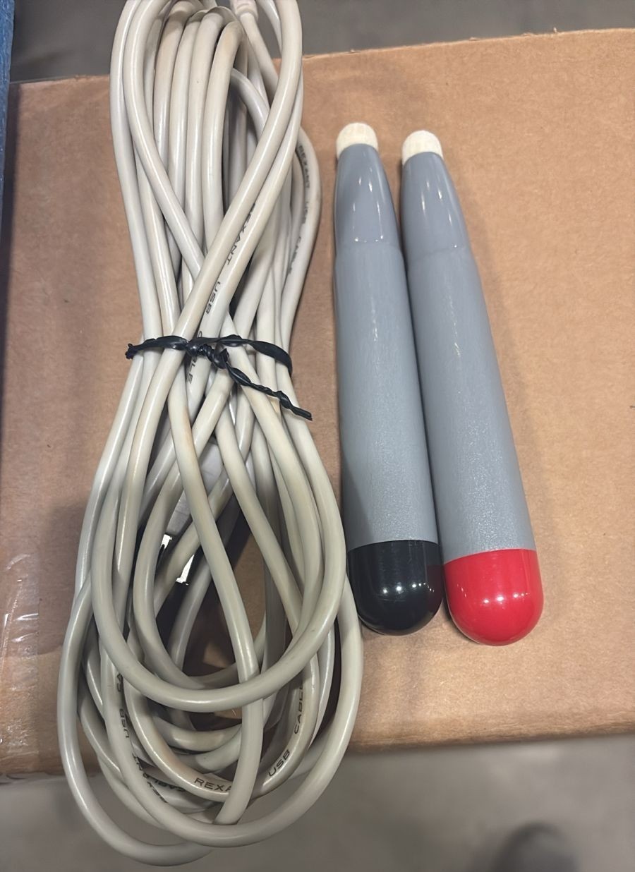 Упаковка вскрывалась. Оборудование использовалось. По углам есть царапины. Рабочая поверхность не пострадала. В комплекте стилусы 2 шт. и кабель USB. Отсутствует крепление на стену.