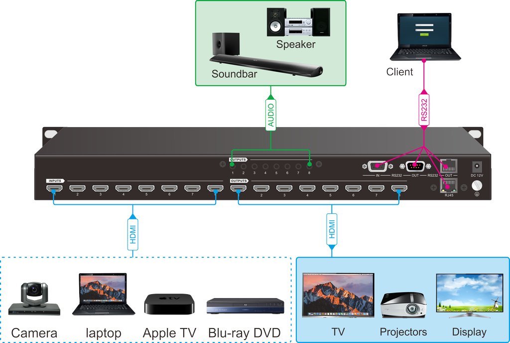 | Выходы | x8 HDMI 1.4 / x8 стерео аудио (3,5 мм) |