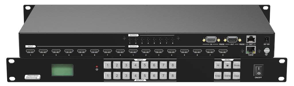 Бесподрывный матричный коммутатор 8х8 Digis, 4K 30Гц 4:4:4 (10,2Гб/с), HDMI 1.4, х8 де-эмбеддер, HDCP 1.3, RS232, пульт ДУ, TCP/IP