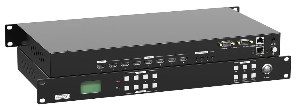 Бесподрывный матричный коммутатор MAMI-44-2SA позволяет переключаться между 4 источниками сигнала и транслировать видео контент на 4 средства отображения. Переключение между источниками происходит бесподрывно, без демонстрации черного экрана.