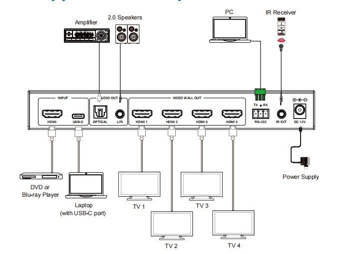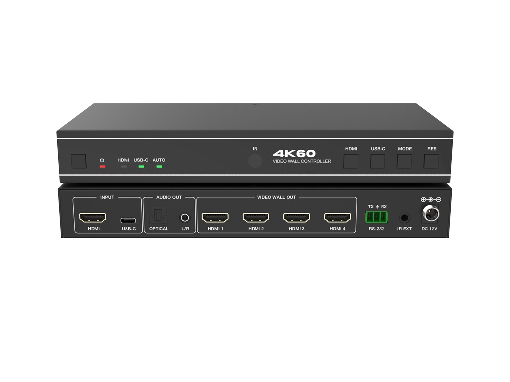 1х4, 4K 60Hz 4:4:4 (18 Гб/с), х1 HDMI + х1 USB-C вход, x4 HDMI выход, RS232, HDCP 2.2, оптический + 3,5мм аудио выход. Поддерживает работу с видеостенами до 4 дисплея.