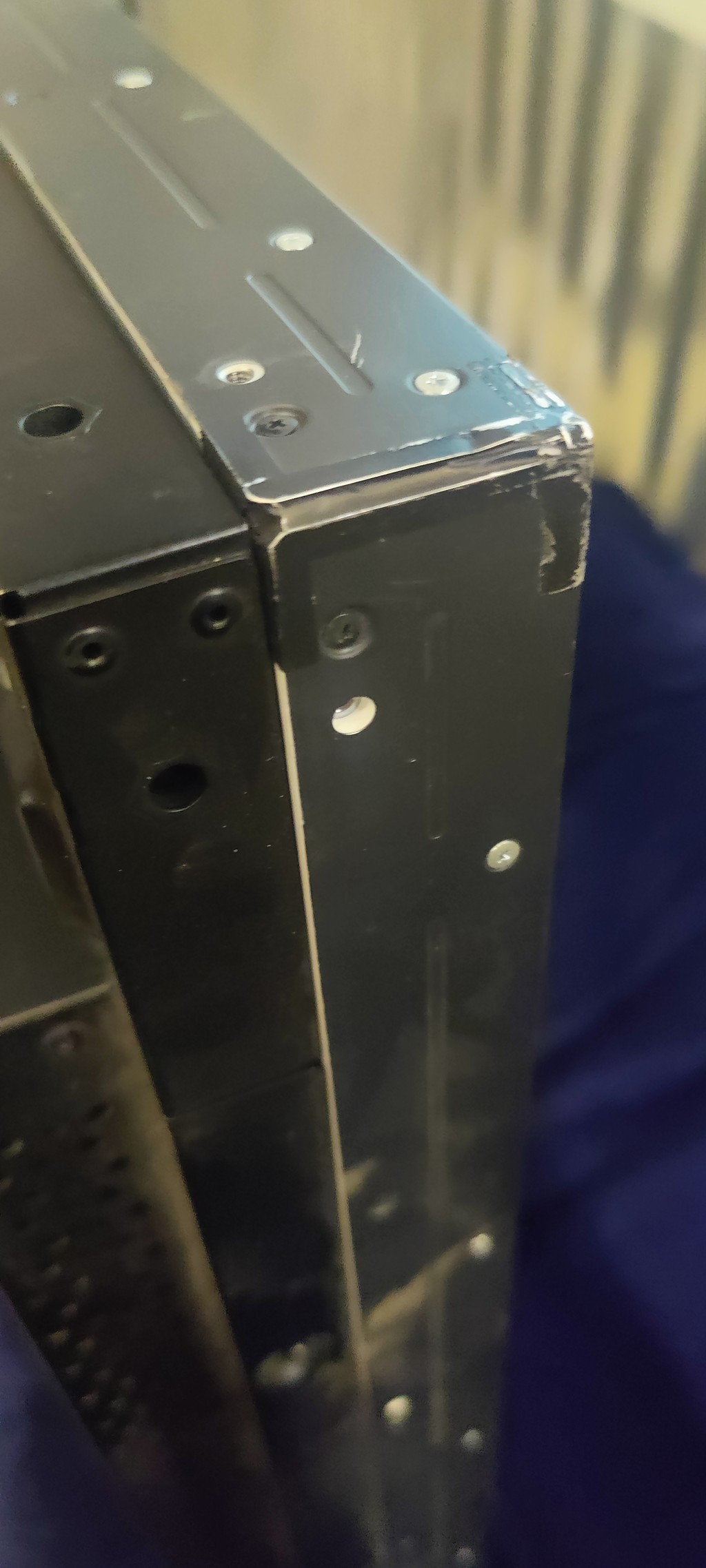 Упаковка вскрывалась, рваная, грязная, вся в скотче. Оборудование использовалось. Со всех сторон на углах видны потертости и сколы. По краям на экране видны небольшие засветы. Шумит кулер. Нет пульта.