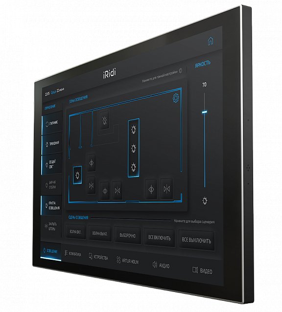 Презентабельное устройство с большим сенсорным экраном для максимально удобного взаимодействия с интерфейсами визуализации и управления всем оборудованием умного дома и офиса.