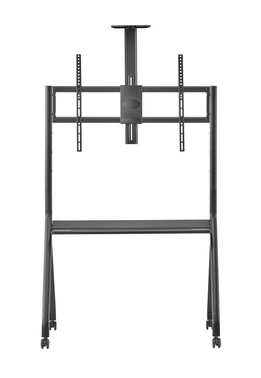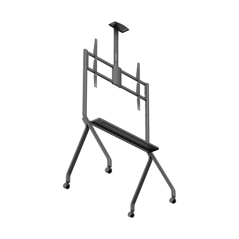 Для ТВ и панелей 55"-100" до 120 кг, VESA до 900x600мм. Полка-лоток + полка для камеры. Регулировка высоты ТВ и полки для камеры. Черная, сталь.
