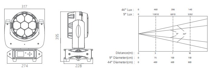 Прожектор имеет зум от 9° до 44°, что позволяет быстро менять угол за 0,8 секунды, создавая разнообразные световые эффекты. Температуру белого можно регулировать в диапазоне от теплого 2800К до холодного 8500К, что дает гибкость в настройке оттенка света.