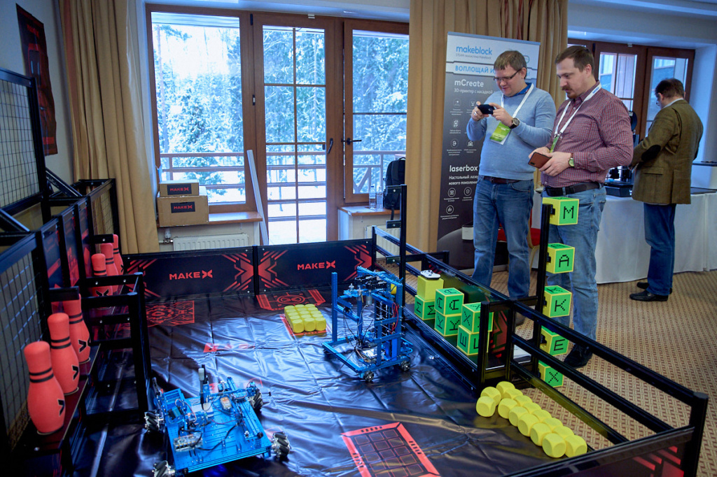 Само собой, демонстрация возможностей наборов была обставлена максимально эффектно: после плотной теоретической части мы перешли к практике! Тем более, что в этот раз новинок у нас было особенно много, и запомнить каждую из них без «личного контакта» было бы сложно. Чтобы не нагружать вас подробностями, ограничимся простым перечислением: робот mTiny для безэкранного программирования (с 4 лет), 3D-принтер со сменной насадкой для лазерной гравировки mCreate, среда mBlock5 с синхронизацией между ПК и мобильной версией.